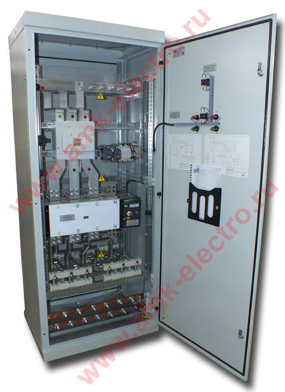 Номинальный ток 800А. Напряжение 380В. Контроль обрыва и чередования фаз ВВОДа №1 и ВВОДа №2 с возможностью выбора основного ввода, с АВТОМАТИЧЕСКИМ или РУЧНЫМ управлением, степень защиты IP31. Есть регулировка по времени срабатывания. Габариты ВхШхГ 2000х800х600мм. Вес нетто 130кг. В данном АВР используются шинные мосты на входах и выходе для подключения большего кол-ва кабельных линий.