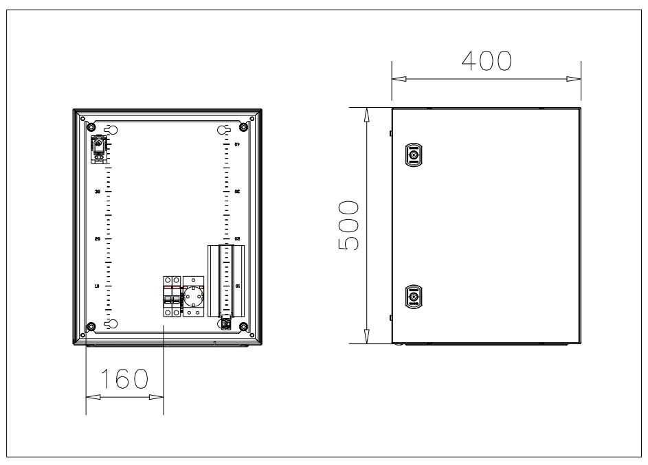 Внутри установлен нагревательный элемент (ТЭН) и терморегулятор позволяющий проводить настройку порога срабатывания в диапазоне 0….+60°C, на боковой стенке установлено устройство для компенсации давления, позволяющие выровнять давление внутри шкафа относительно окружающие среды.